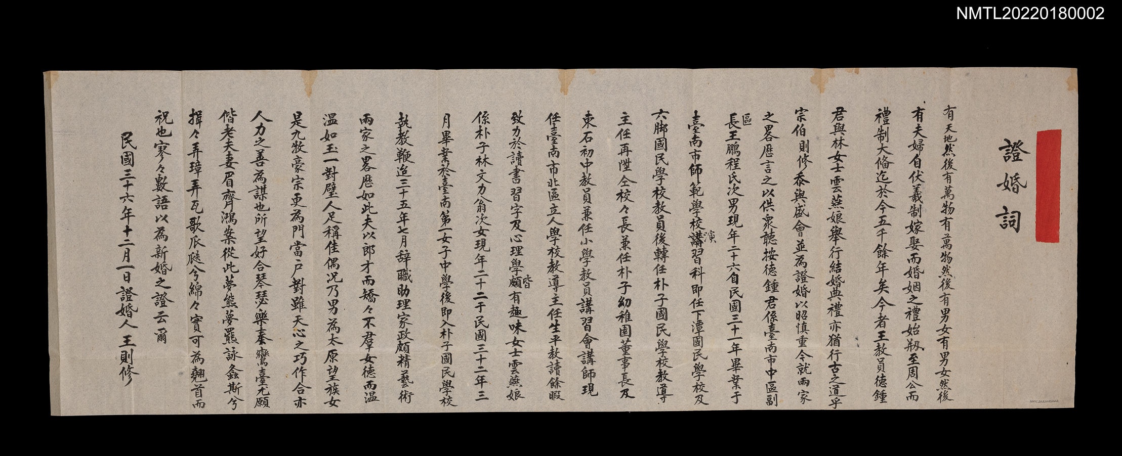 This is the handwritten marriage testimonial for the wedding of Wang Te-chung and Lin Yun-yan, written by Wang Tse-hsiu in regular script. Wang Te-chung was the second son of Wang Peng-cheng, who was a student of Wang Tse-hsiu. The text praises the newlywed's aptitude in studies, and hopes that their marriage will be harmonious and fulfilling, supporting both personal virtue and professional excellence, and allowing them to contribute to society. It functions as not only proof of the wedding, but a statement of blessing by the older generation of scholars, and an expression of their passing the torch of their families and knowledge to the next generation.