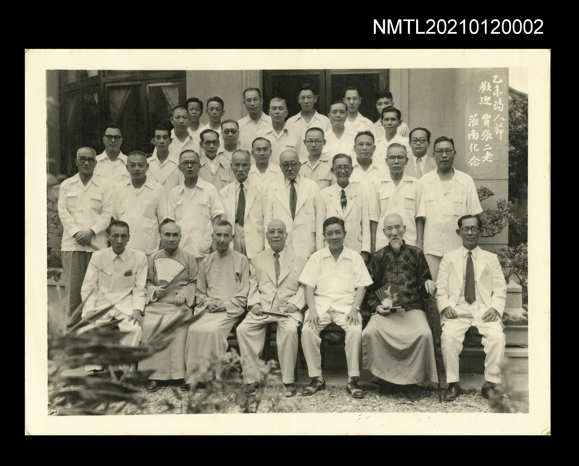 Taken May 4 1929 at the Wufeng Lin Family Mansion's Great Flower Hall, when the 50th birthdays of Lin Yu-chun and Chuang Sung were being celebrated. Attendees included Lin Hsien-tang, Fu Hsi-chi, Chuang Sung, Lin Yu-chun, Lin Chieh-tang, Cheng Ju-nan, Chen Huai-cheng, Chhòa Chú-chiau, Wang Shih-peng, Wu Tzu-yü, and Lin Yao-ting. The Oak Poetry Society began holding shouchun gatherings in 1926, and they served as both poetic society gatherings and celebratory events.