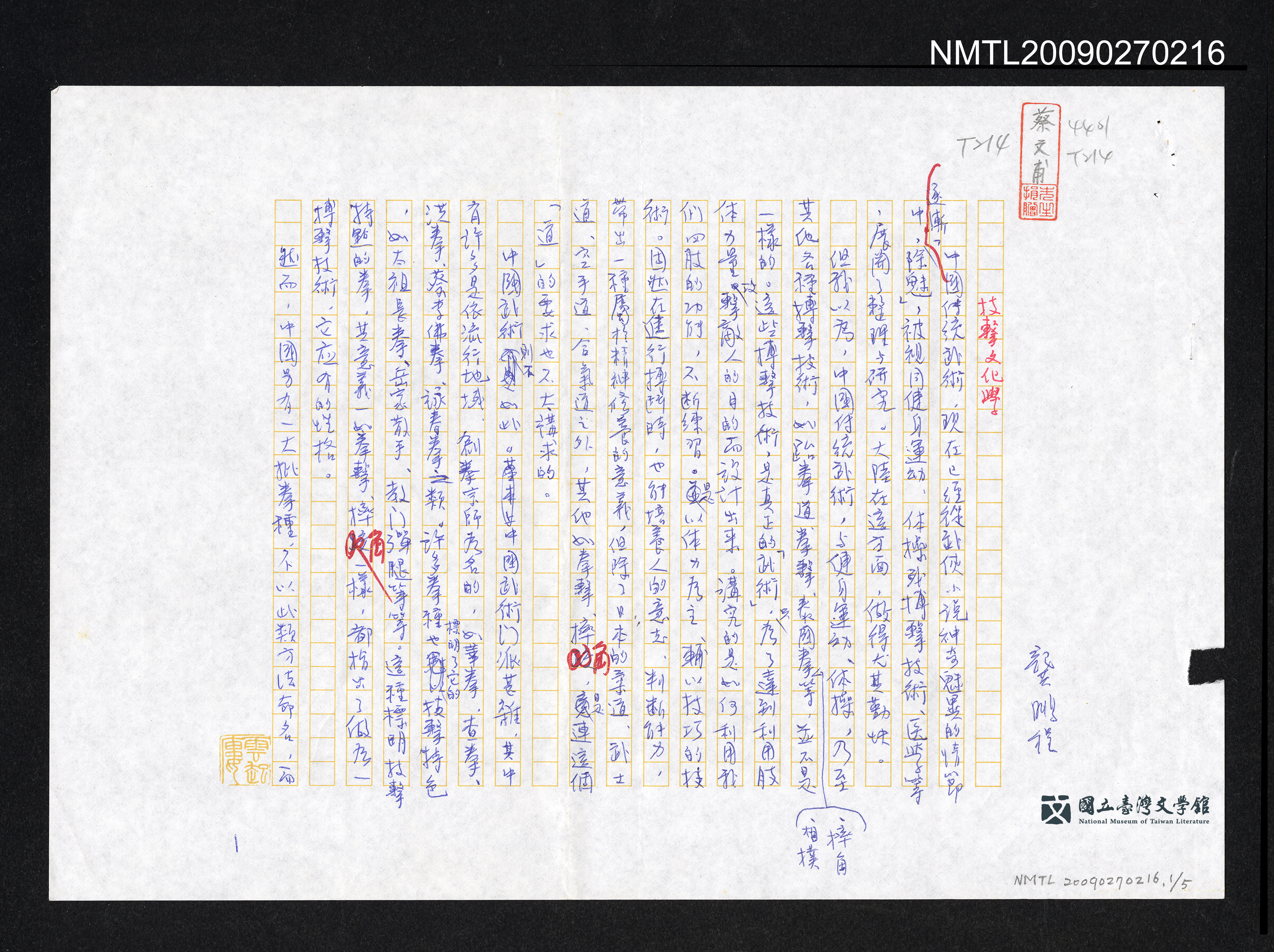 〈技擊文化學〉全文五張手稿,作者龔鵬程認為中國武術與詩歌、書法一樣皆具有「依類象形」的觀念性,體現「道」的文化內涵,