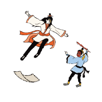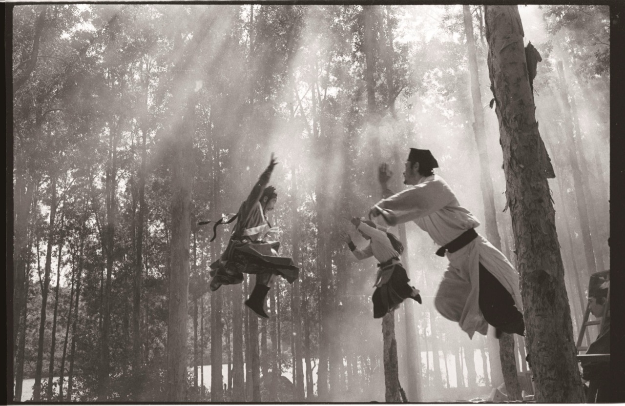胡金銓執導的《俠女》於1968年2月7日正式開拍,1970年7月在台上映。此工作照為空中對決,左起韓英傑(飾許顯純)、徐楓(飾楊慧貞/之芸)、白鷹(飾石問樵)。