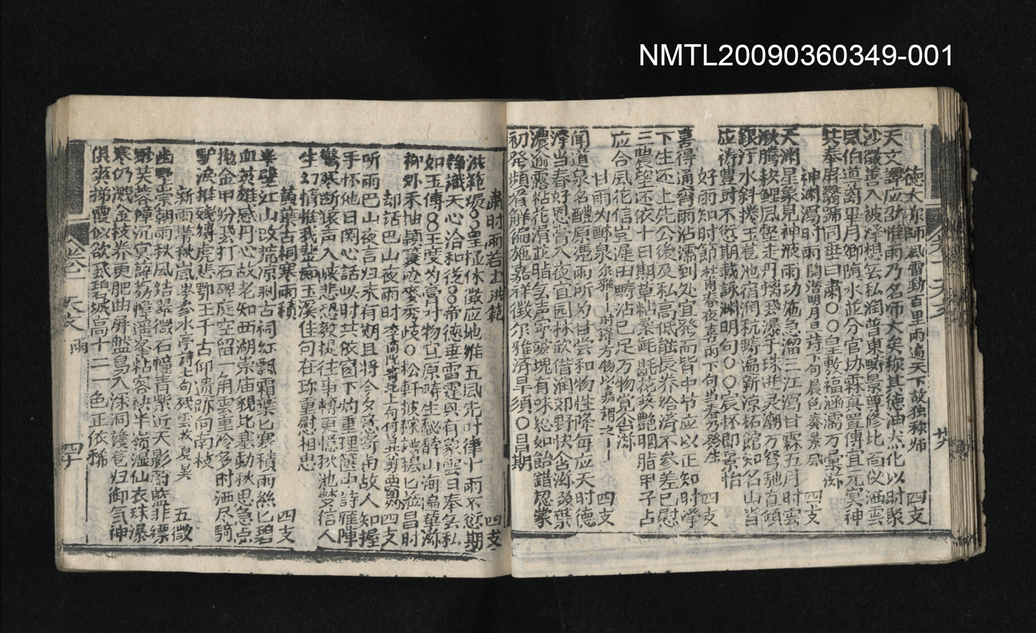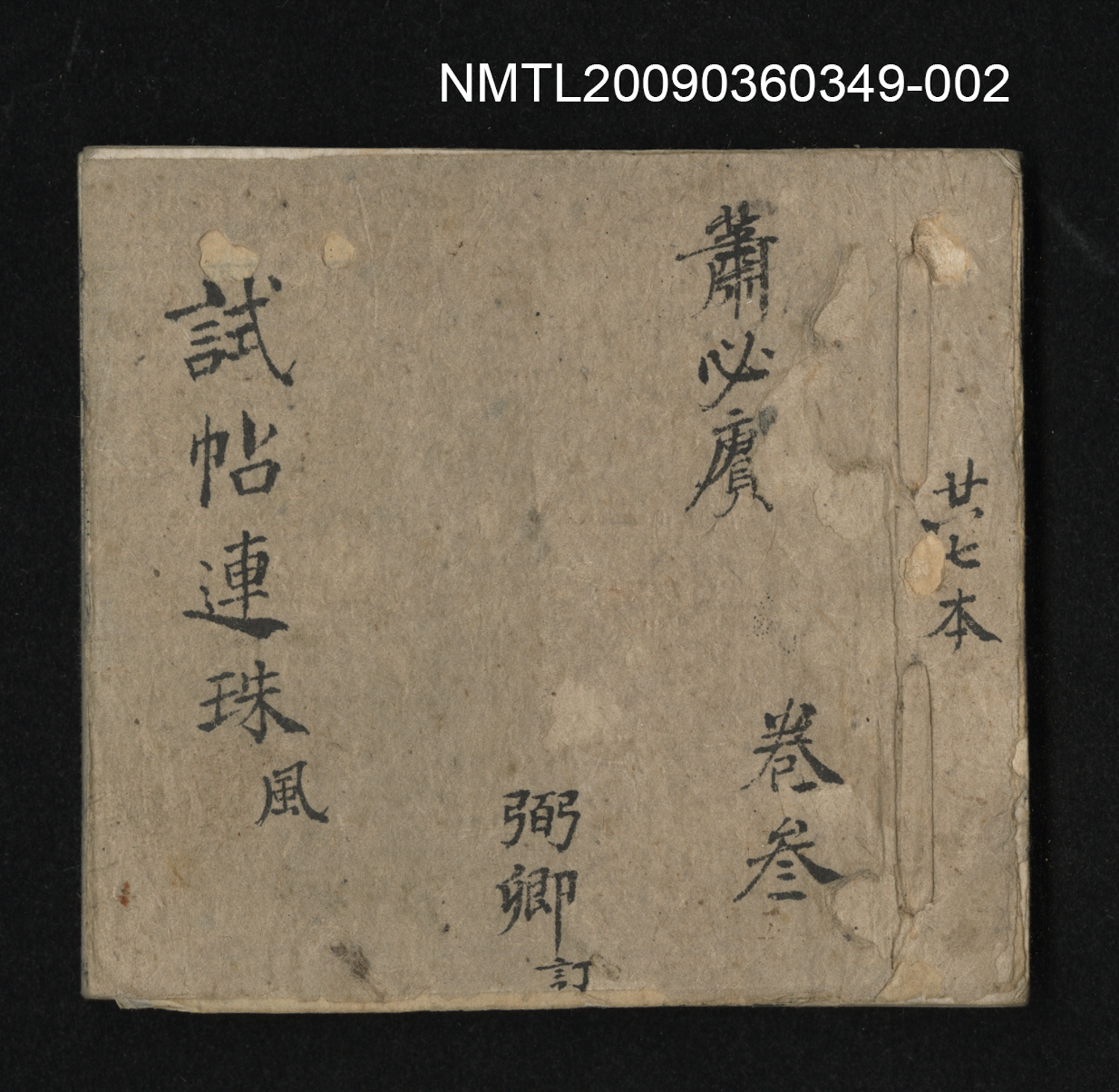 備考印刷本參考書。題名《試帖連珠》,以宋代程顥詩句「雲淡風輕近午天」分卷次,卷二題「淡」字。內容依韻部歸類,便於查閱參考。翻開頁為「四支韻」,其中一題〈好雨知時節〉,出自唐代杜甫〈春夜喜雨〉。試帖詩規定以五言排律作詩,並須點題(題字需嵌入首二聯)。