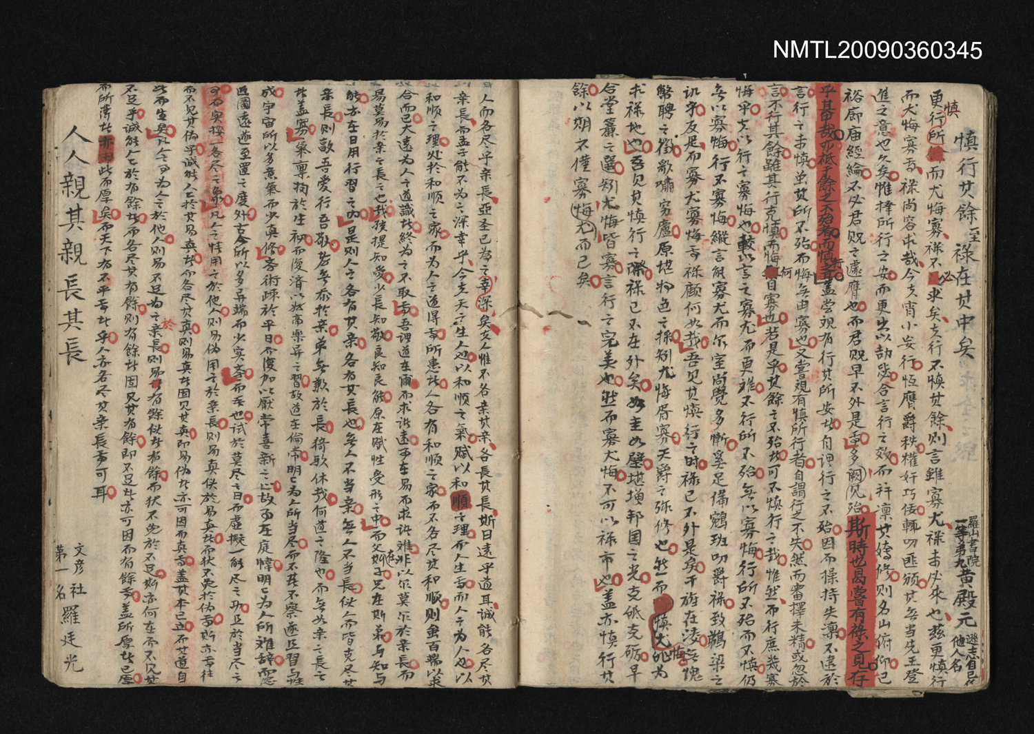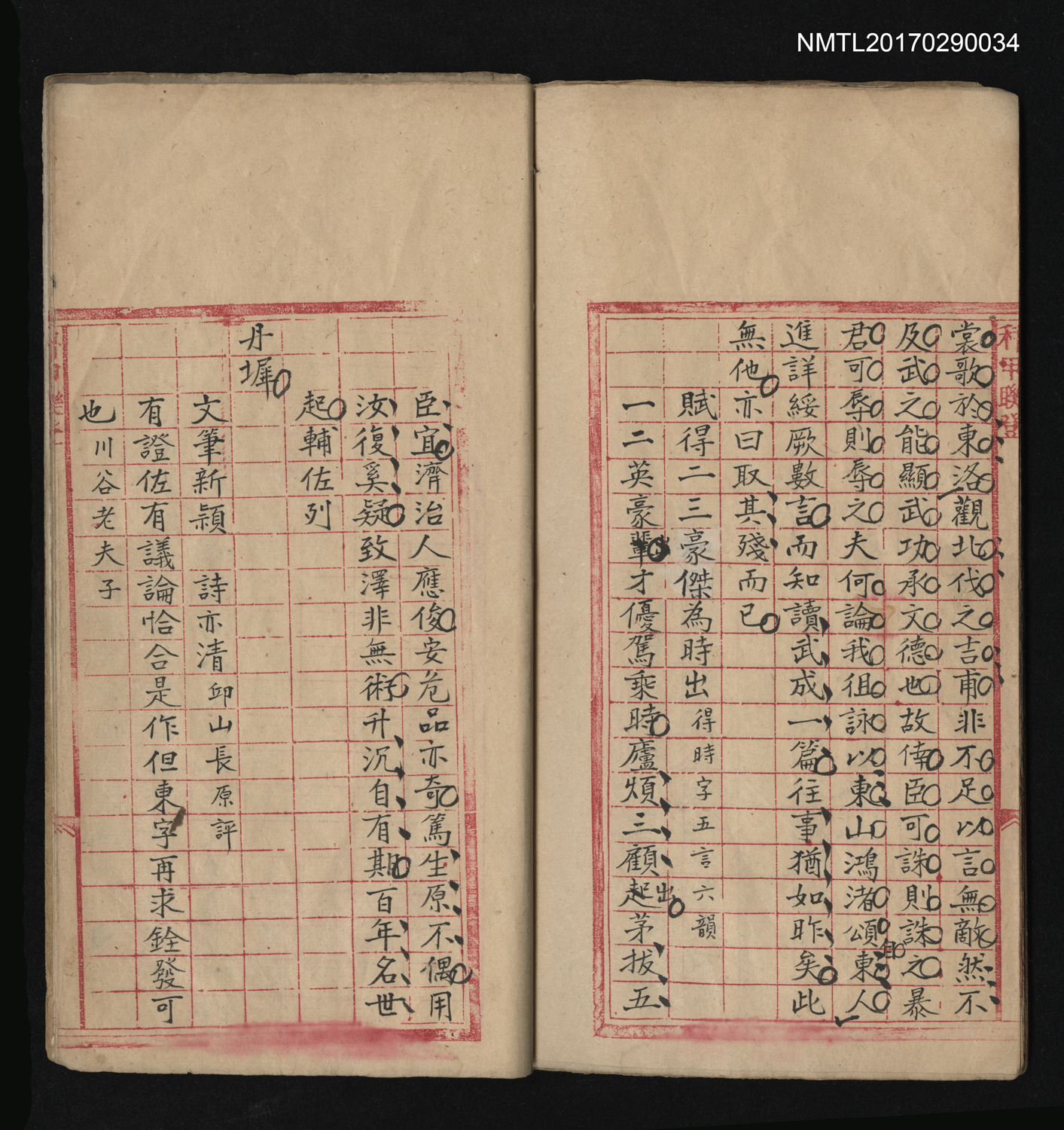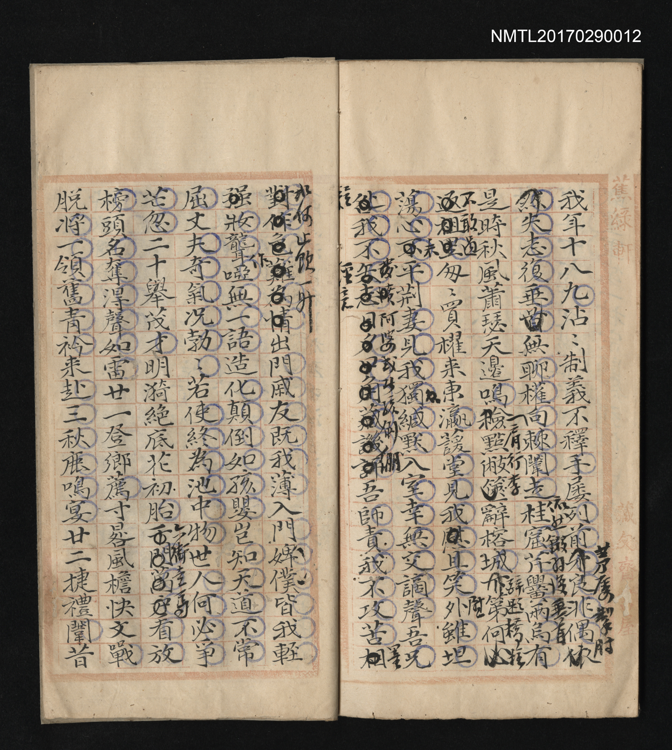 文人備考筆記。「窗課」指書齋課業,內容抄錄前人八股文佳作以備應試。文題「慎行其餘,則寡悔。言寡尤,行寡悔,祿在其中矣」,出自《論語‧為政篇》,為羅山書院一等第九黃殿元所作。冊幅約掌大,小楷抄寫,朱筆圈點分段,貼紅紙訂正,呈現清代士子勤學苦讀、應對科舉的態度。