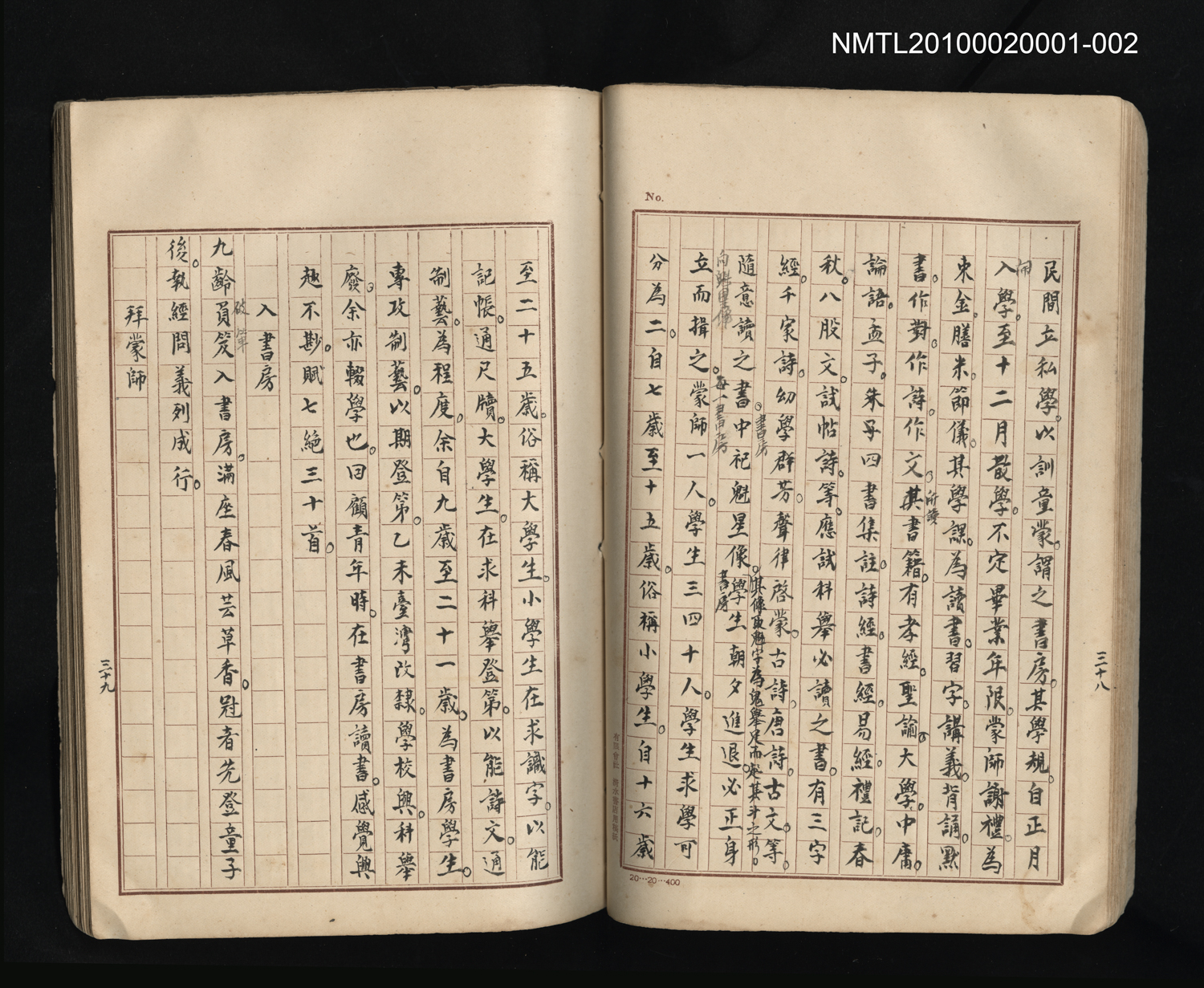 詩稿收錄〈書房三十首有序〉組詩,描寫童年入書房啟蒙讀書的情景。七歲以上的「小學生」主要學習識字與基本書信往來;十六歲以上的「大學生」則以詩文與制藝為主,準備科舉考試。詩作反映書房中長幼有序、誦讀經書的日常,以及傳統教育與科舉取士的學習過程。黃純青晚號晴園老人,為瀛社、薇閣吟社社員。