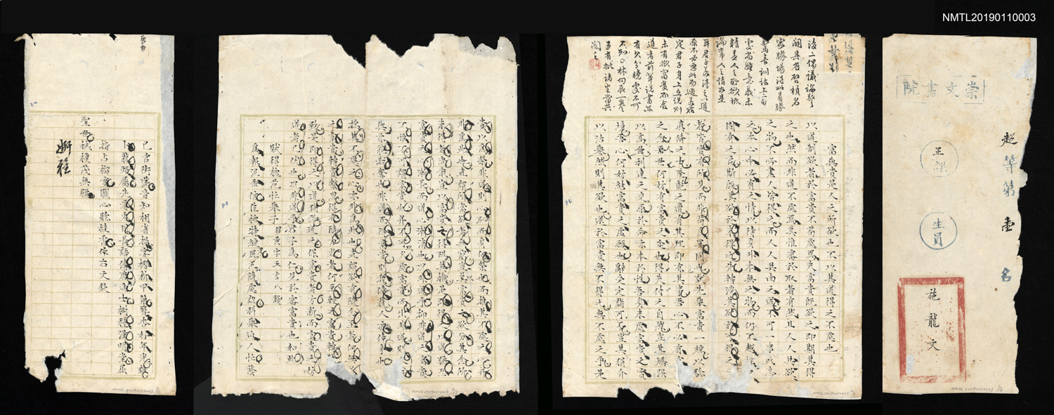 「愚因僥倖榜首,刻欲急需,祈仁台撥出佛銀拾元,或撥多少,交付來人先行應用,切不可候。黃相公甫慎卿○ 學洙初泐」。推測為陳守愚考上童生後,向黃慎卿借款的書信。急需款項可能用於向座師致贈紅包及印製大紅名刺,以便依禮節拜訪、投刺報喜。書末「學洙」推測為陳守愚學名,「初泐」表示此為首次書信。呈現清末文人在科舉及社交往來中的實際的經濟需求與禮節規範。