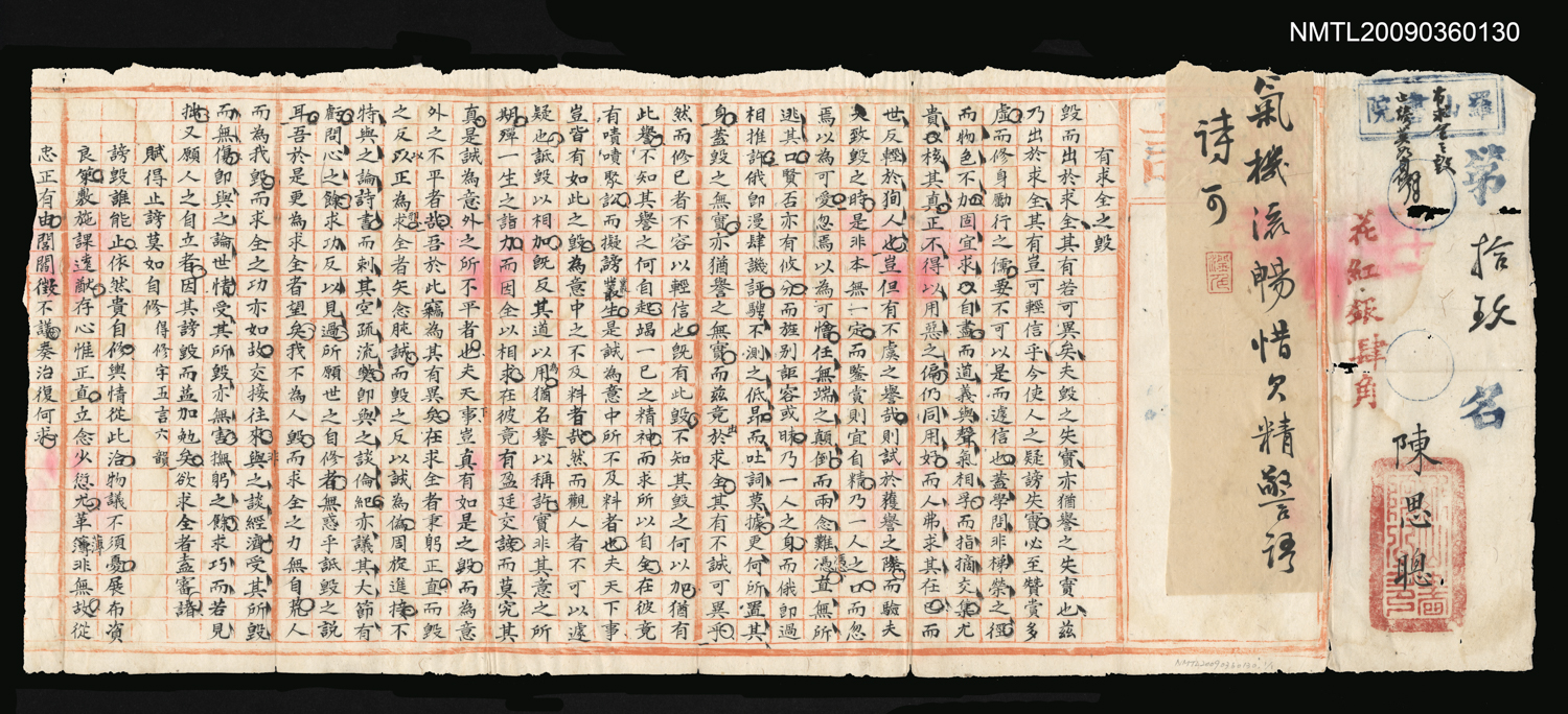 施龍文在臺南崇文書院課考中獲「超等」第一名的課卷。文題出自《論語‧里仁篇》:「富與貴,是人之所欲也;不以其道得之,不處也。」書院是清代士子研習與備考之地,每月舉行官課、師課,課卷含文題與詩題,依成績評等。詩題屬試帖詩,與八股文同為清代童試、鄉試與會試的考試內容。本卷為其考中秀才之前的習作。施龍文為臺南人,道光25年(1845)中進士,與次子施士洁為臺灣唯一的父子進士。
