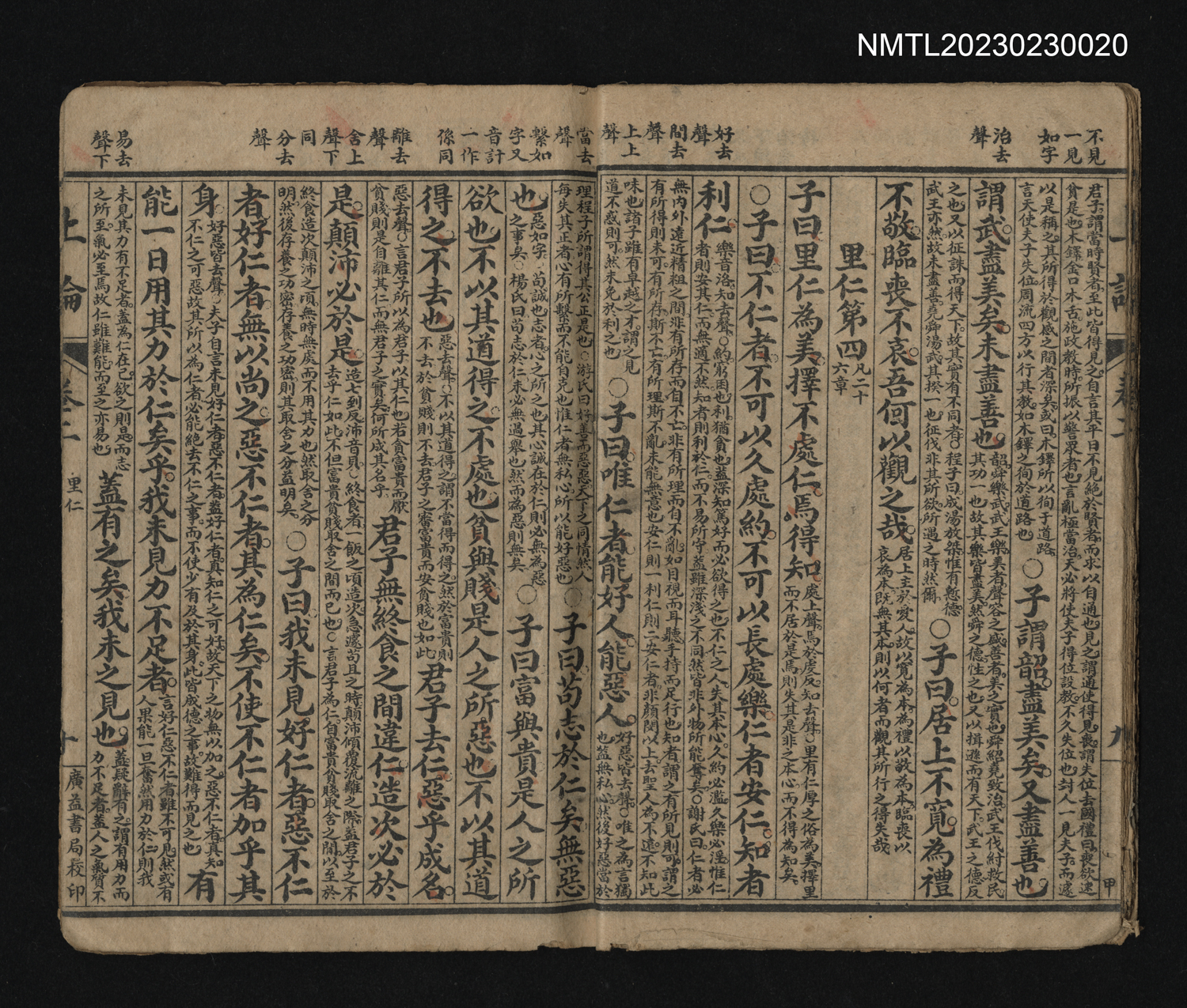 印刷本參考書,內頁大字為《論語》原文,小字為註解。翻開頁為《論語‧里仁第四》,文中有「里仁為美……富與貴,是人之所欲也」等句,即為施龍文課卷的文題出處。科舉鄉試與會試第一場考試的文題與詩題均出自四書(論語、孟子、大學、中庸),為科舉備考的內容,亦是傳統教育的啟蒙讀物。書名頁題「鄭榮慰讀」,為鄭榮慰受教於鄭家珍時所用課本。