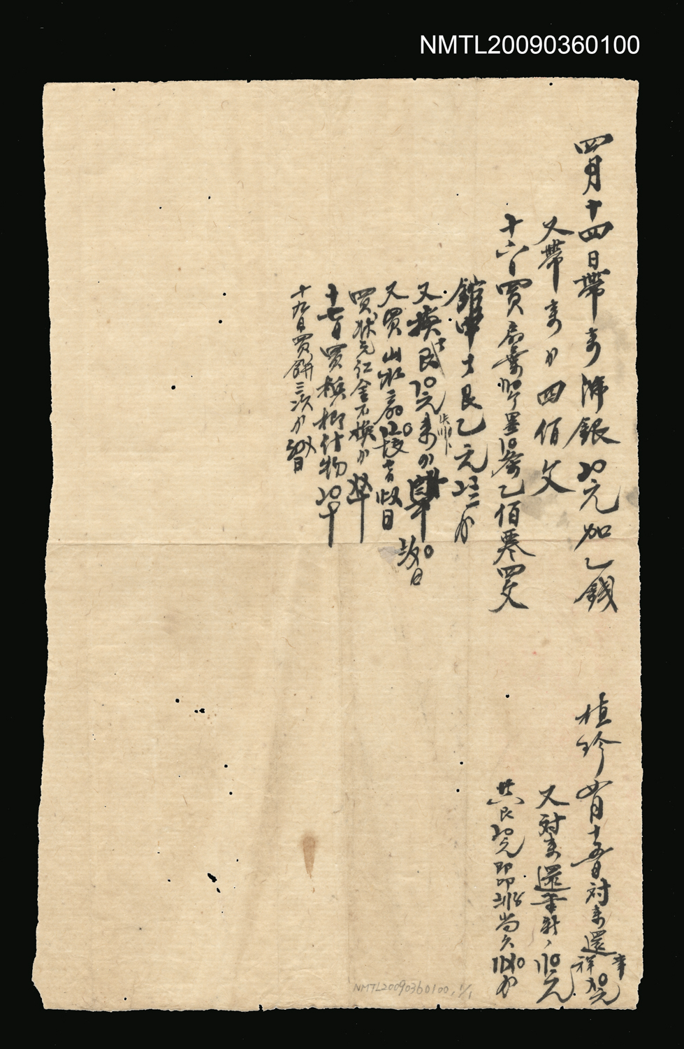 此筆記記錄清末文人在備考期間的日常開支,包括購買扇葉、墨條、山水扇、狀元紅、金不換(紙張)、檳榔、雜物與餅等,並登載銀錢往來與欠款狀況。文中使用蘇州碼與傳統符號標註金額,便於快速計算。內容呈現清末臺灣文人日常經濟收支的實況,也反映當時常見的消費項目與生活樣貌。