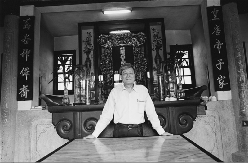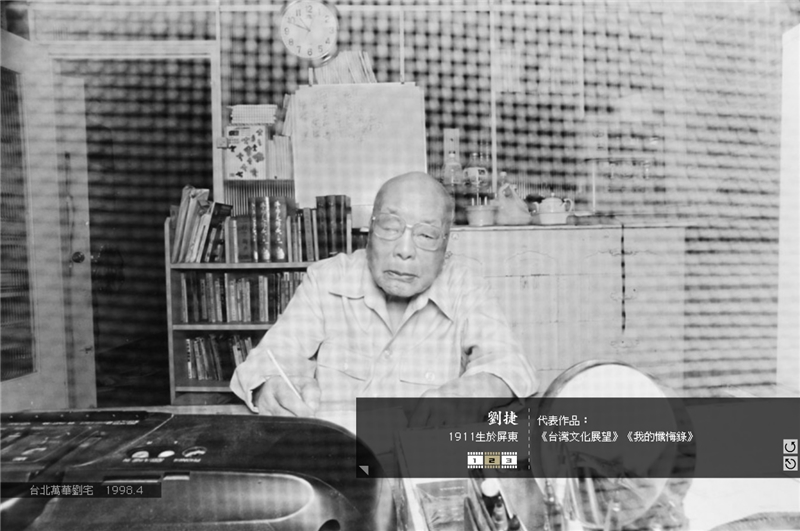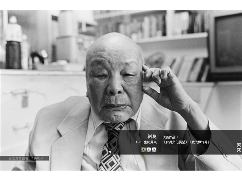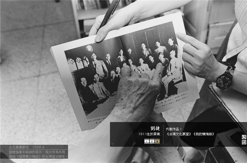 臺北萬華劉宅 1998.4 劉捷指著年輕時的照片,照片中為共同發起《福爾摩沙雜誌》的臺灣留日學生。