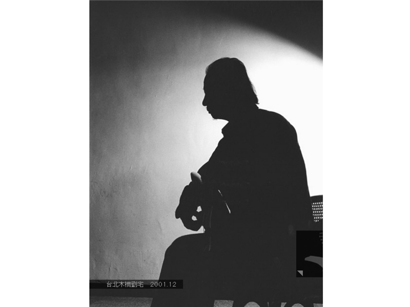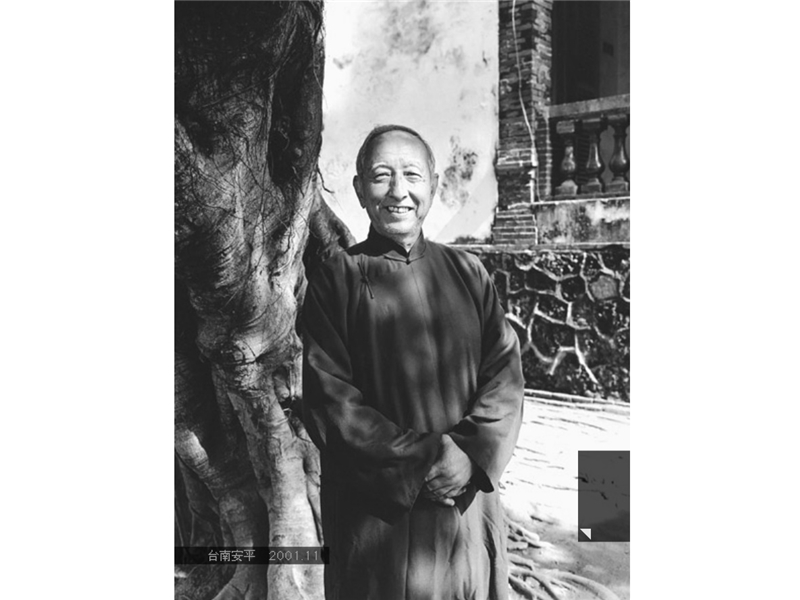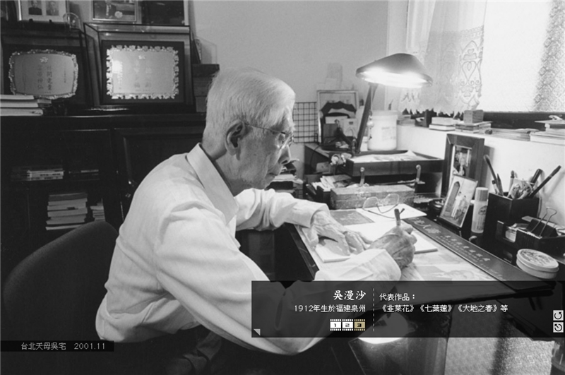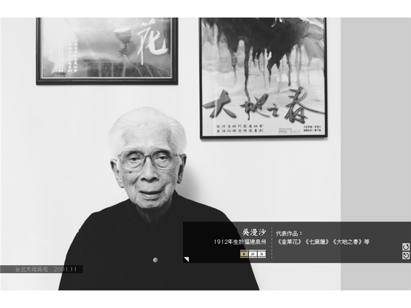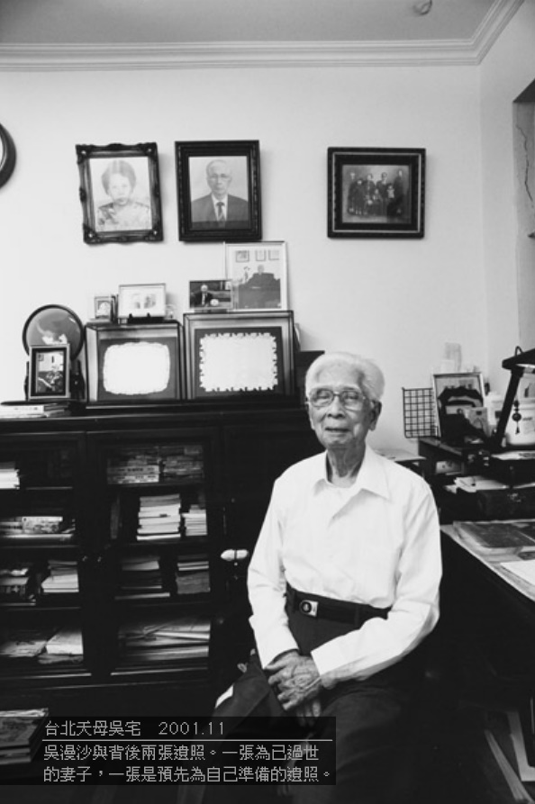 臺北天母吳宅 2001.11 吳漫沙與背後兩張遺照。一張為已過世的妻子,一張是預先為自己準備的遺照。