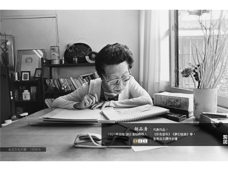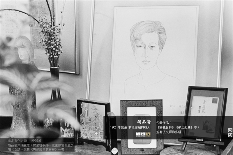 臺北文化大學1998.6胡品清素描畫像,席慕蓉手繪。此畫像曾刊登於現代女詩人選集《剪成碧玉葉層層》一書