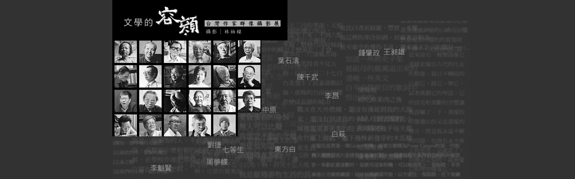 本次展出的相片為攝影家林柏樑的作品。林柏樑是臺灣老字號的報導攝影能手,自一九九八年起,在文資中心時期,即陸續進行臺灣老中輩作家的拍攝計畫。此計畫的進行有順利也有困難的地方,也有與時間賽跑的壓力。國立臺灣文學館成立之後,接手此一檔案照片,總共有二十三位作家。