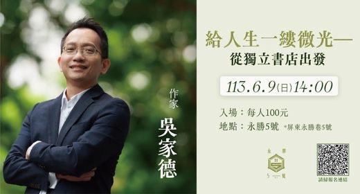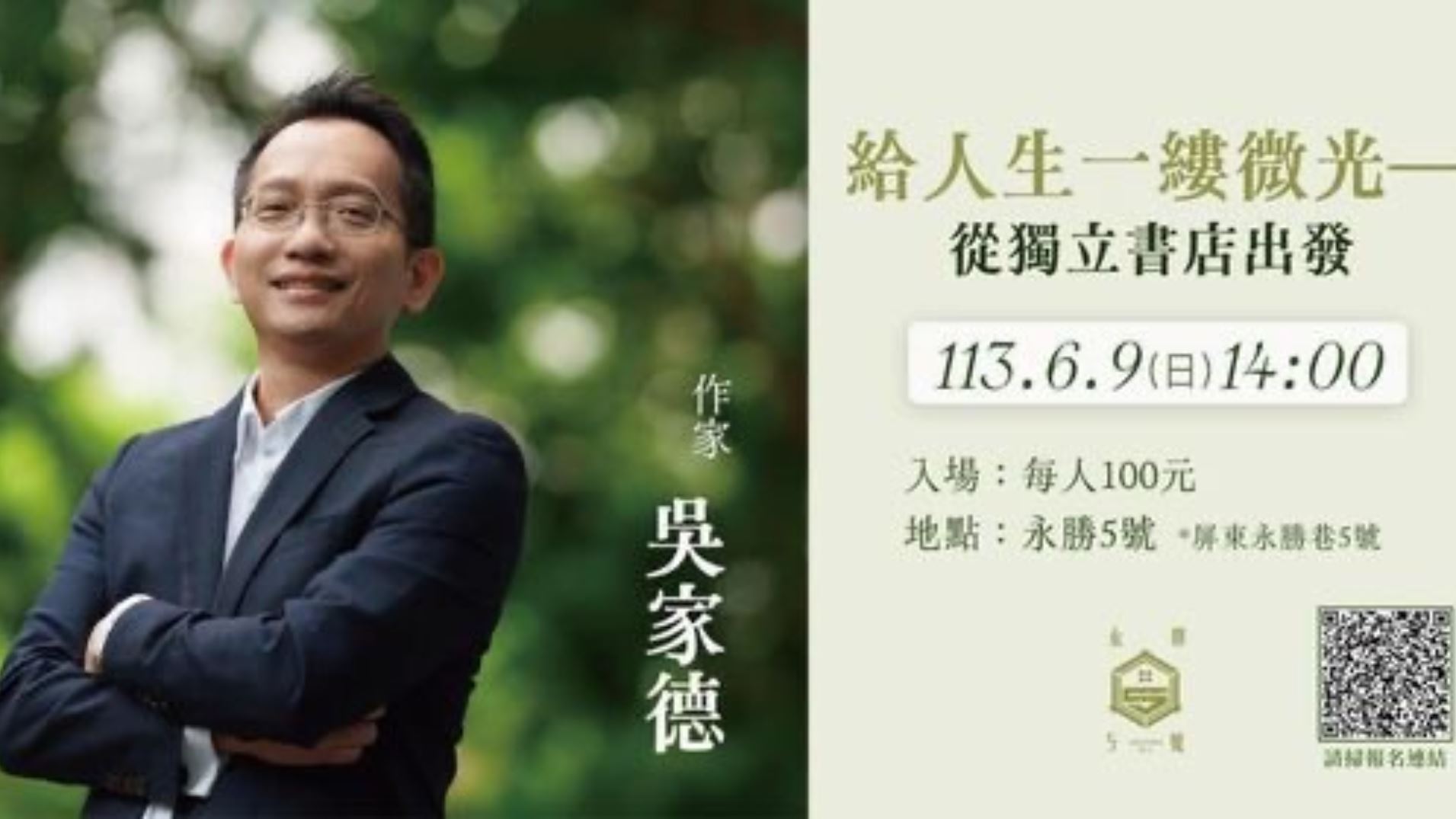 6月9日下午2時,吳家德老師將到永勝5號和大家分享「給人生一縷微光─從獨立書店出發」,老師想和朋友一起聊聊關於熱情、人脈、利他等等走踏人生的秘訣。