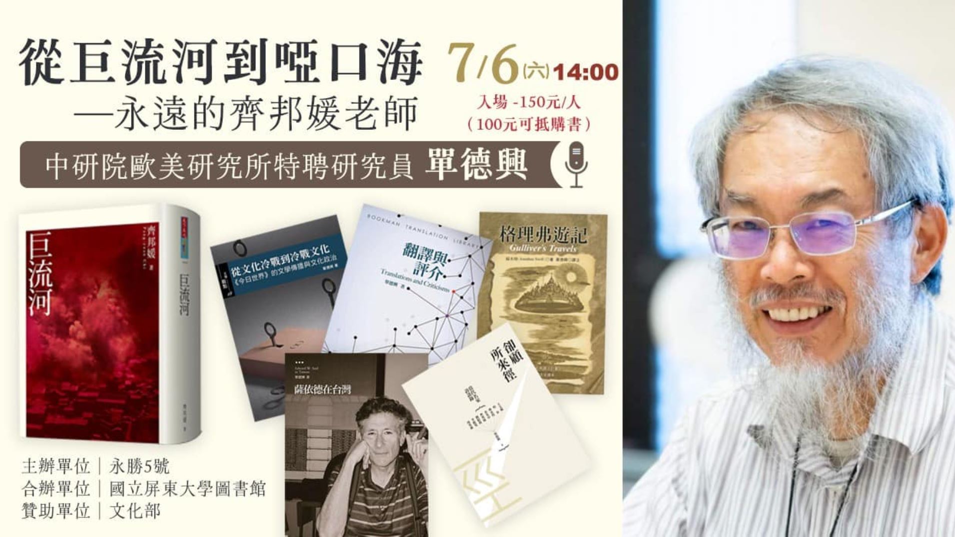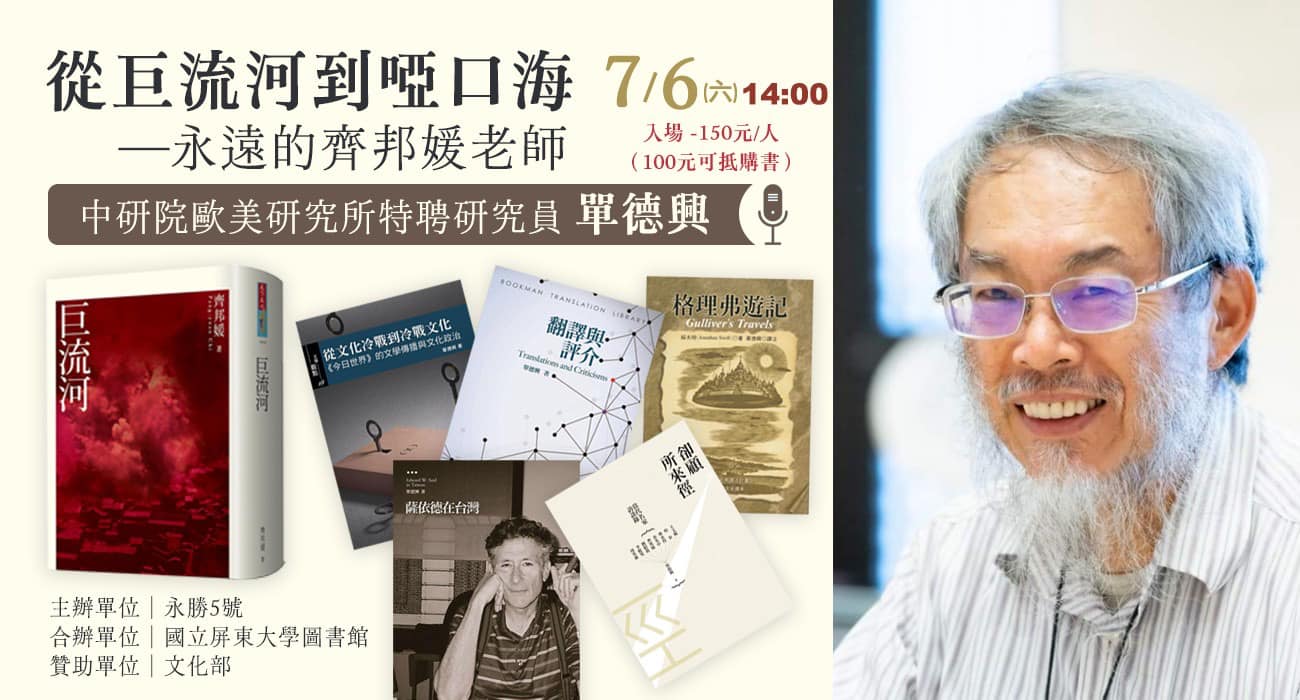 齊邦媛老師在《巨流河》中形容單德興老師是「點燃火炬的人」,也是「陪跑者」。7月6日下午2時,單德興老師將帶領我們重新看見《巨流河》,重新認識齊邦媛老師,重新領略那一代文人穩重持久的人生特質。
