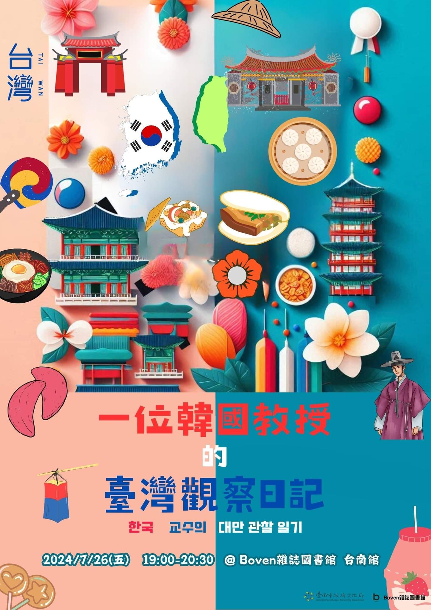 而7/26(五)晚上7:00 在我們的好鄰居 boven 雜誌圖書館 台南館,柳泳夏教授也將分享有關他在疫情前所出版,有關台灣與韓國文化觀察的書籍《台灣散步》內容講座。